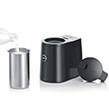 Recipiente com controle de temperatura para armazenamento de leite. Se conecta com máquinas da marca Jura para preparo do leite vaporizado automaticamente.